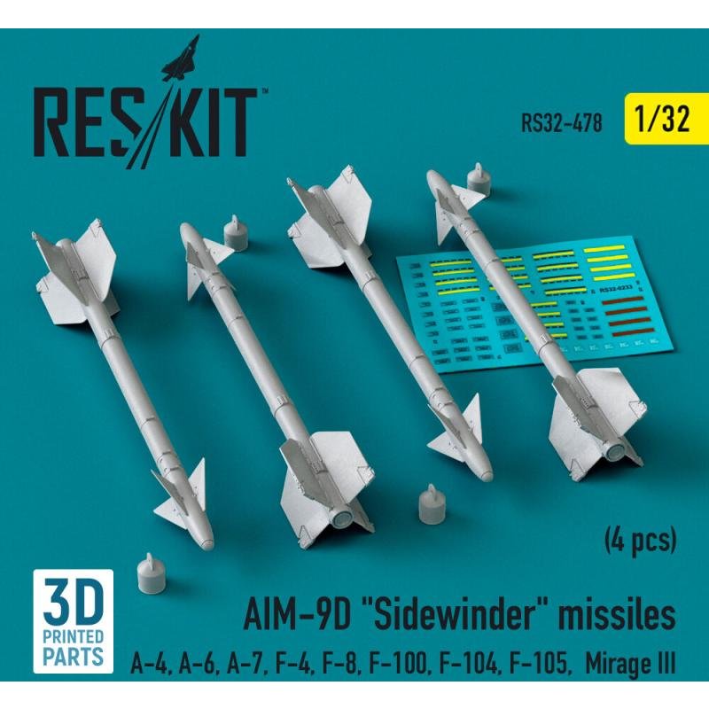 AIM-9D Sidewinder missiles (4 pcs) (A-4, A-6, A-7, F-4, F-8, F-100, F-104, F-105, Mirage III) (3D Printed)
