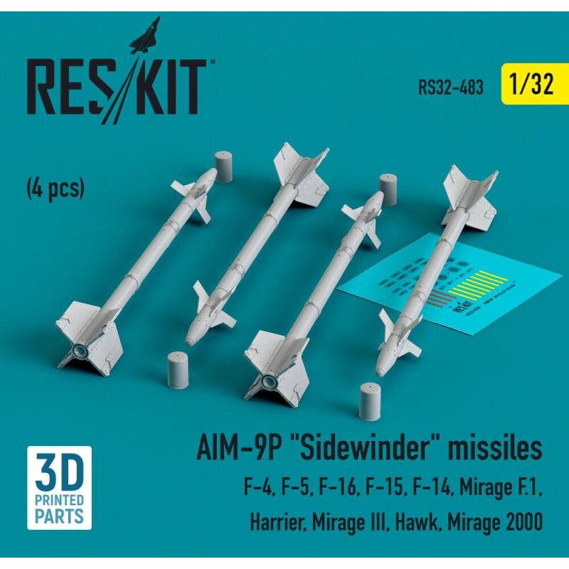 AIM-9P Sidewinder missiles (4 pcs) (F-4, F-5, F-16, F-15, F-14, Mirage F.1, Harrier, Mirage III, Hawk, Mirage 2000) (3D Printed)