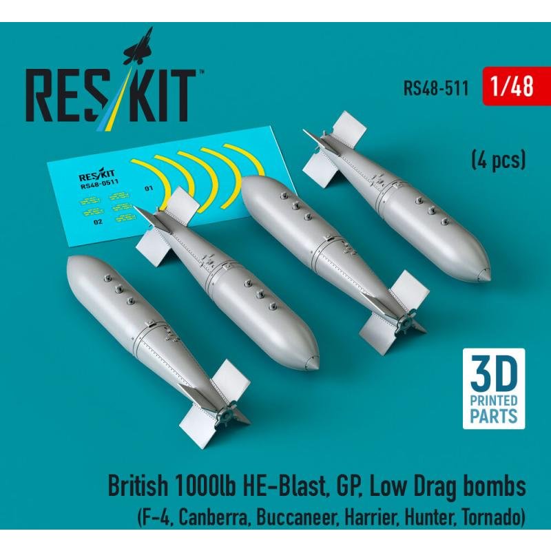 British 1000lb HE-Blast, GP, Low Drag bombs (4 pcs) (F-4, Canberra, Buccaneer, Harrier, Hunter, Tornado) (3D printed)