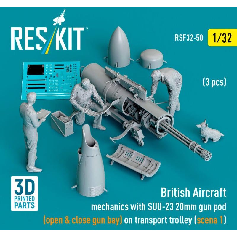 British Aircraft mechanics with SUU-23 20mm gun pod (open & close gun bay) on on transport trolley (scene 1) (3 pcs) (3D Printed)