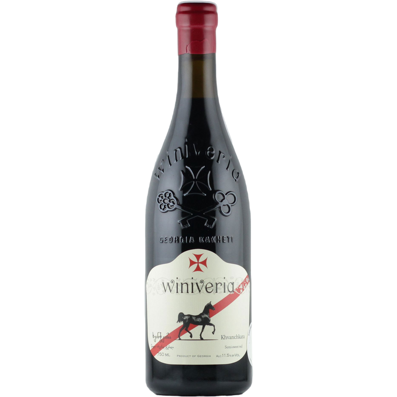 Lagerung bis zu 10 Jahre. Dekantieren ist nicht erforderlich, jedoch sollte er eine halbe Stunde vor dem Servieren geöffnet werden. Winiveria liegt in der renommierten Weinregion Kachetien in Georgien und wurde Anfang der 2000er Jahre von George Piridashvili im Zuge der Wiederbelebung des georgischen Weinmarktes gegründet. Das Unternehmen hat sich zum Ziel gesetzt, hochwertige Weine aus einheimischen Rebsorten und mit traditionellen Techniken, aber mit einem modernen Ansatz herzustellen, um den hohen Wert georgischer Weine weltweit bekannt zu machen. Die Trauben werden in Zusammenarbeit mit lokalen Winzern bezogen. Der Wein wird aus ausgewählten Aleksandrouli-Trauben hergestellt, die aus der Appellation Khvanchkara stammen, einer der renommiertesten Georgiens, die sich in der Region Racha-Lechkhumi befindet. Hier schaffen das gemäßigte Klima, geschützt durch die georgischen Berge, und die Lehmböden ideale Bedingungen für einen hochwertigen Weinbau und den reinen Ausdruck mehrerer einheimischer und traditioneller Rebsorten. Das Ergebnis ist ein charaktervoller, ausgewogener und unverwechselbarer Wein. In der Nase offenbart er ein reichhaltiges und breites Aromaprofil mit duftenden Noten von roten Früchten wie Erdbeeren und roten Beeren, gefolgt von einem Hauch von Pflaumen und Rosinen, vor einem Hintergrund von Marzipan, Honig und getrockneten Rosenblättern. Am Gaumen ist er großzügig und rund, mit mittlerem Körper und einer samtigen Textur. Er ist geschmeidig, weich und konzentriert, mit einem langen, fruchtigen Abgang, der einen Hauch von Süße offenbart. Genießen Sie ihn zu mittelreifen Käsesorten und würzigen Wurstwaren.